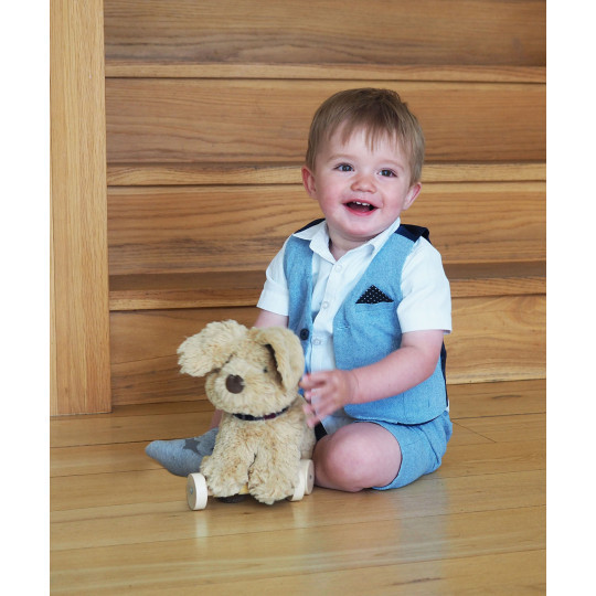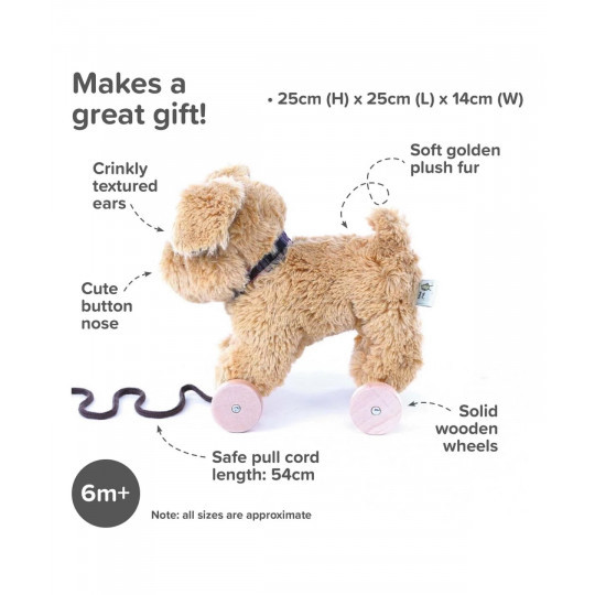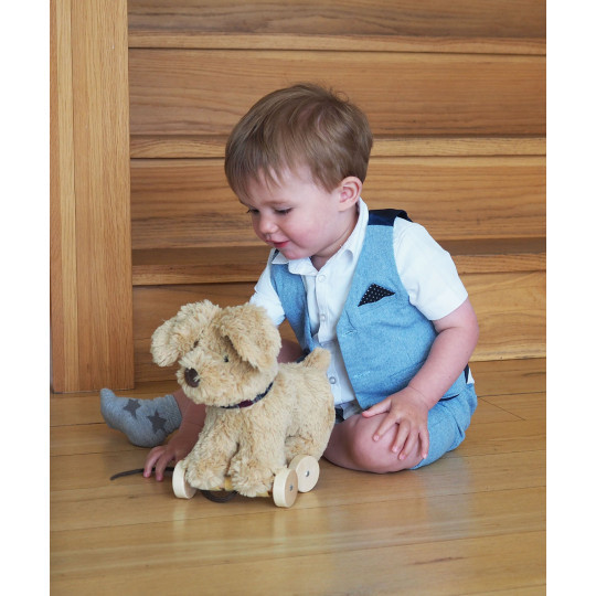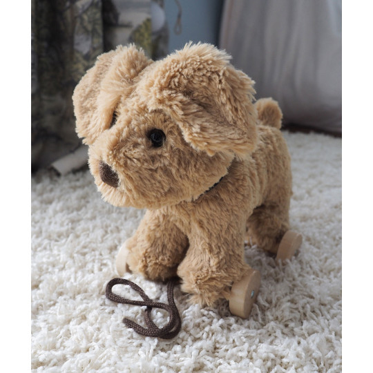 Hunden Dexter är både ett dragdjur och en kramvänlig vän. Han har en supermjuk guldgul päls, en liten nos och stora prassliga öron för taktil stimulering.
