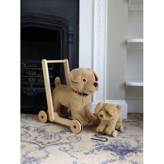 Trähjulen är fästa med kardborrband under tassarna och tas enkelt av och på. Snöret att dra med är fäst på de främre hjulparet.