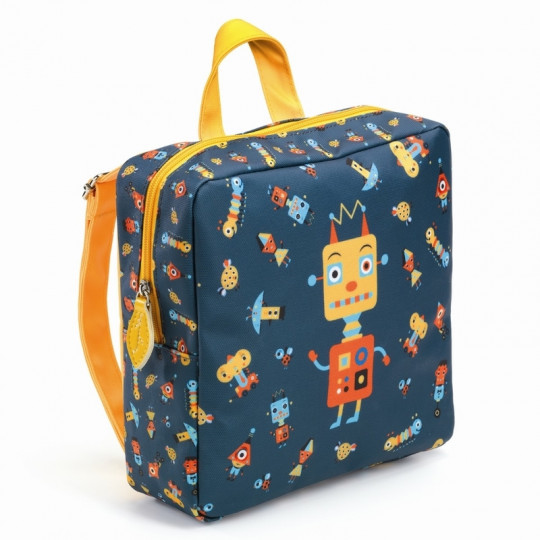 Fin väska i vacker blågrå färg med varma gula detaljer. Tryckta robotmotiv som dekoration. Väskan är tillverkad i fodrad canvas, har reglerbara axelremmar och handtag överst på väskan. Inne i väskan finns ett mindre fack och väskan har också en etikett där du kan märka den med barnets namn och kontaktuppgifter.
