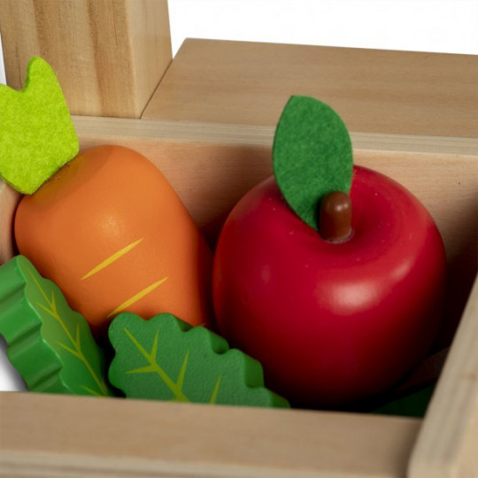 Fint lekset i trä innehållande; kam, två olika borstar, äpple, morot och salladsblad.
